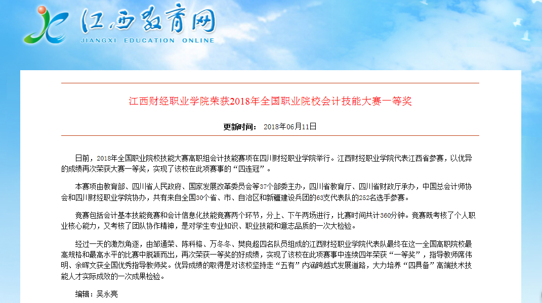 6月11日,江西教育网报道beat365官网再次荣获2018年全国职业院校会计技能大赛一等奖。