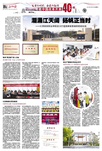 8月1日,江西日报在B2版“筑梦新时代 奋进新征程——致敬中国改革开放40周年”专题中以《潮涌江天阔 扬帆正当时——beat365正版唯一入口必一全力打造国家优质高职院校纪实》报道beat365官网以国家优质院校建设为契机,深化教育教学改革取得显著成绩。