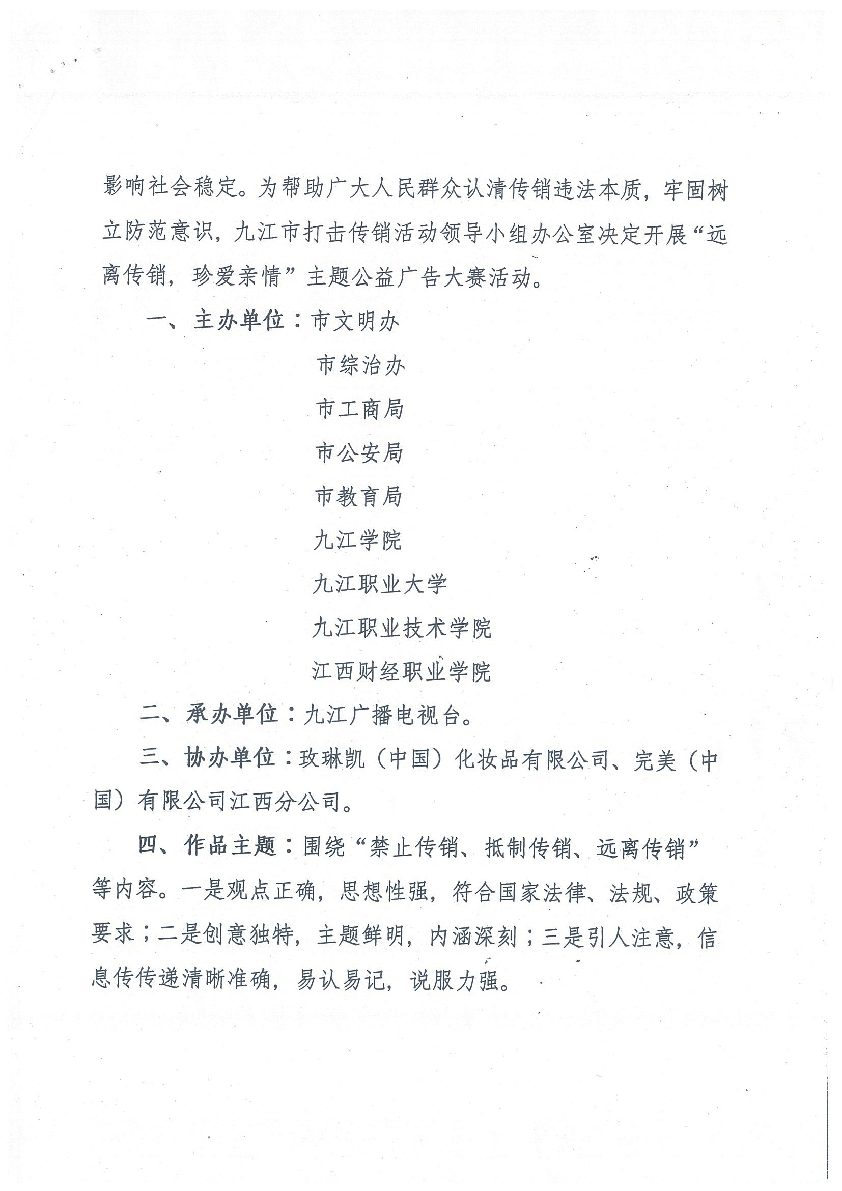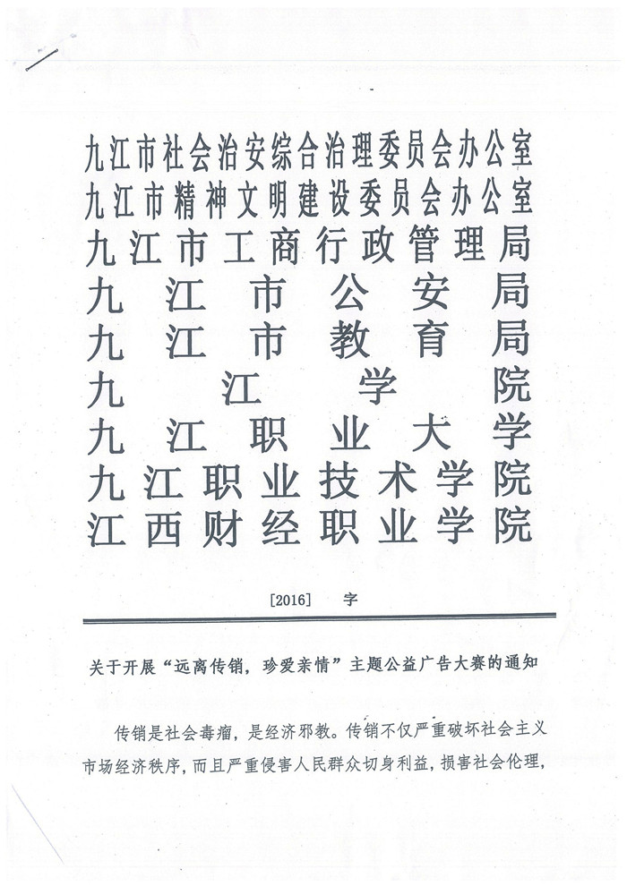 为帮助广大人民群众认清传销违法本质,牢固树立防范意识,九江市打击传销活动领导小组办公室决定开展“远离传销,珍爱亲情”主题公益广告大赛活动。