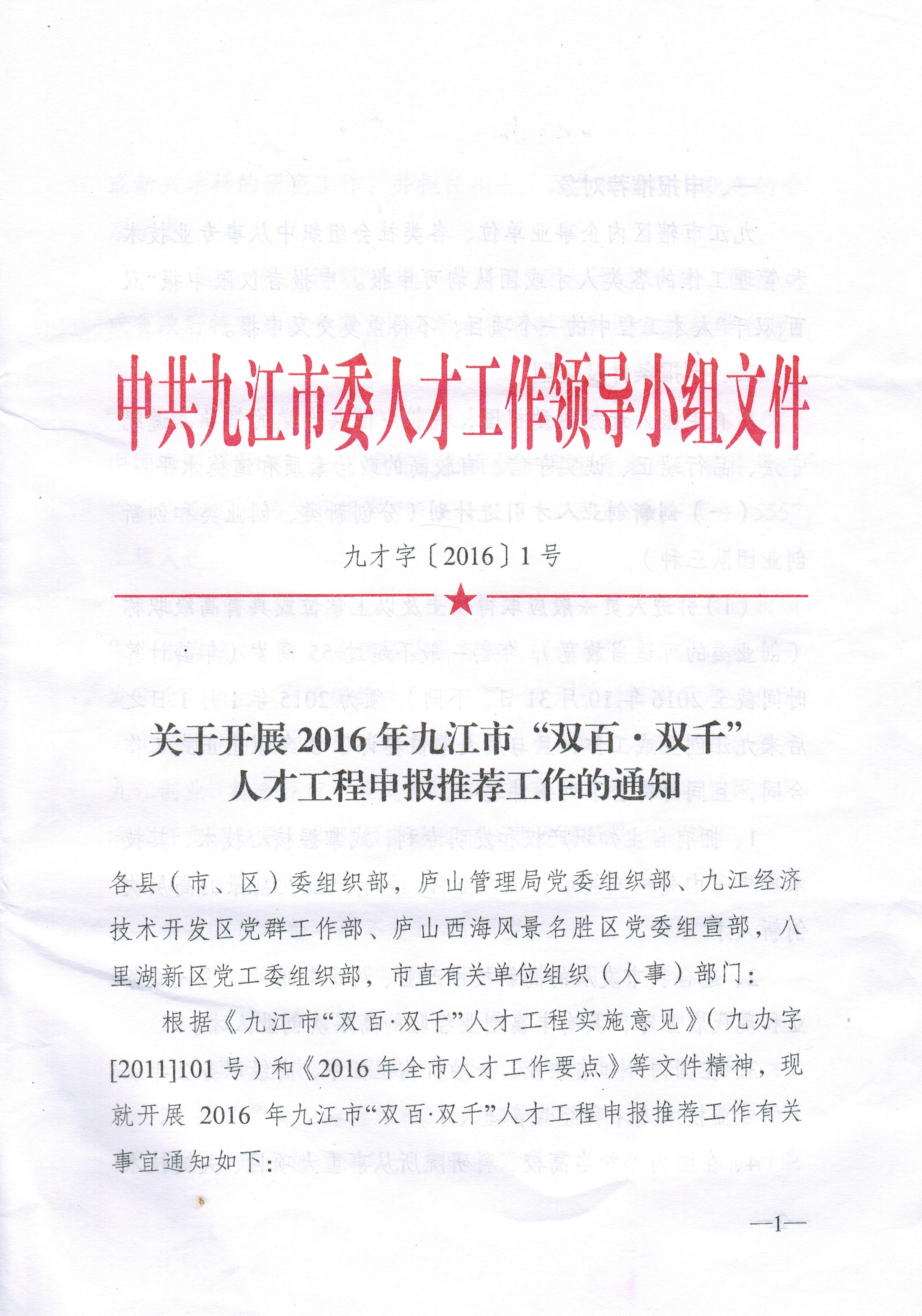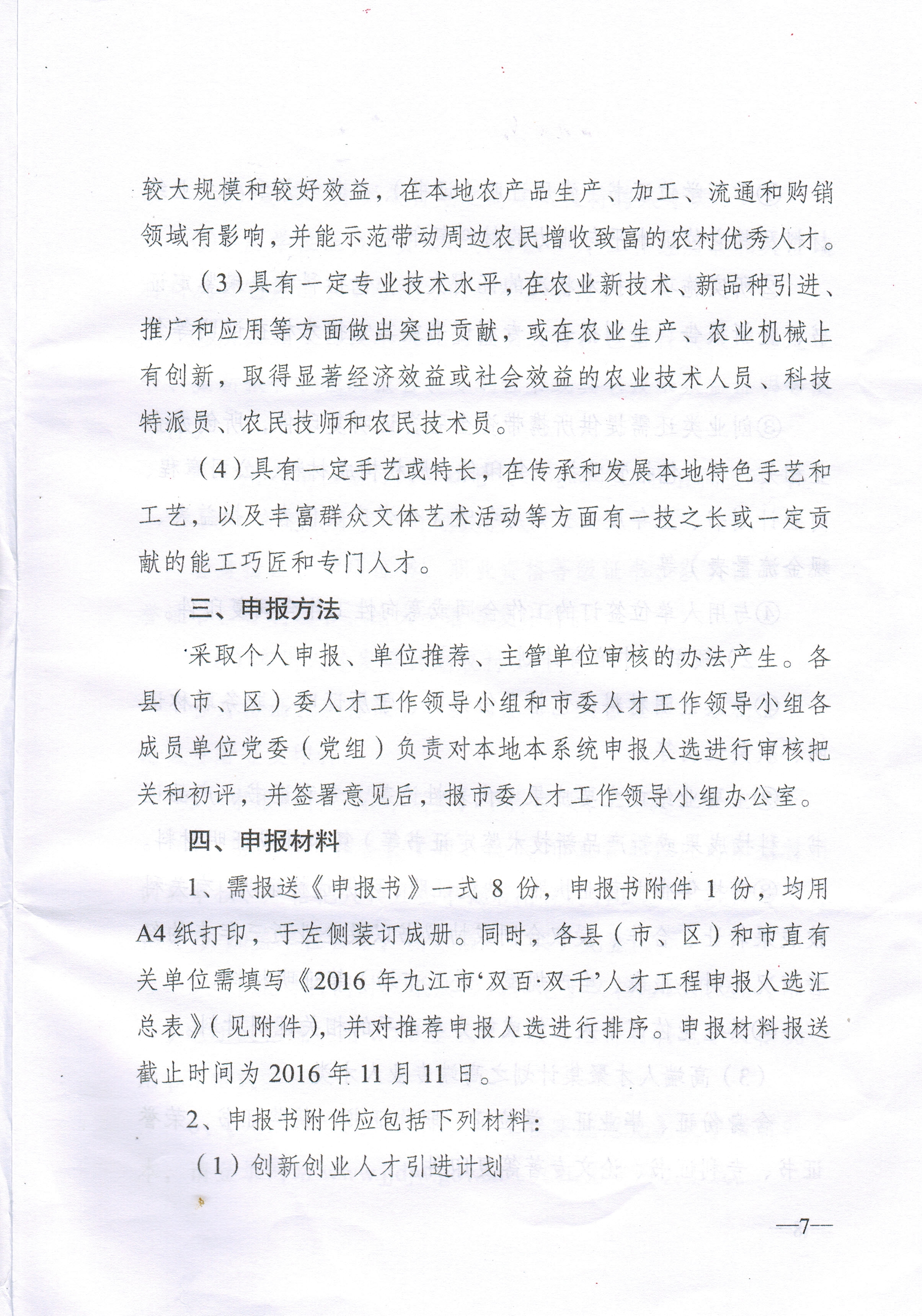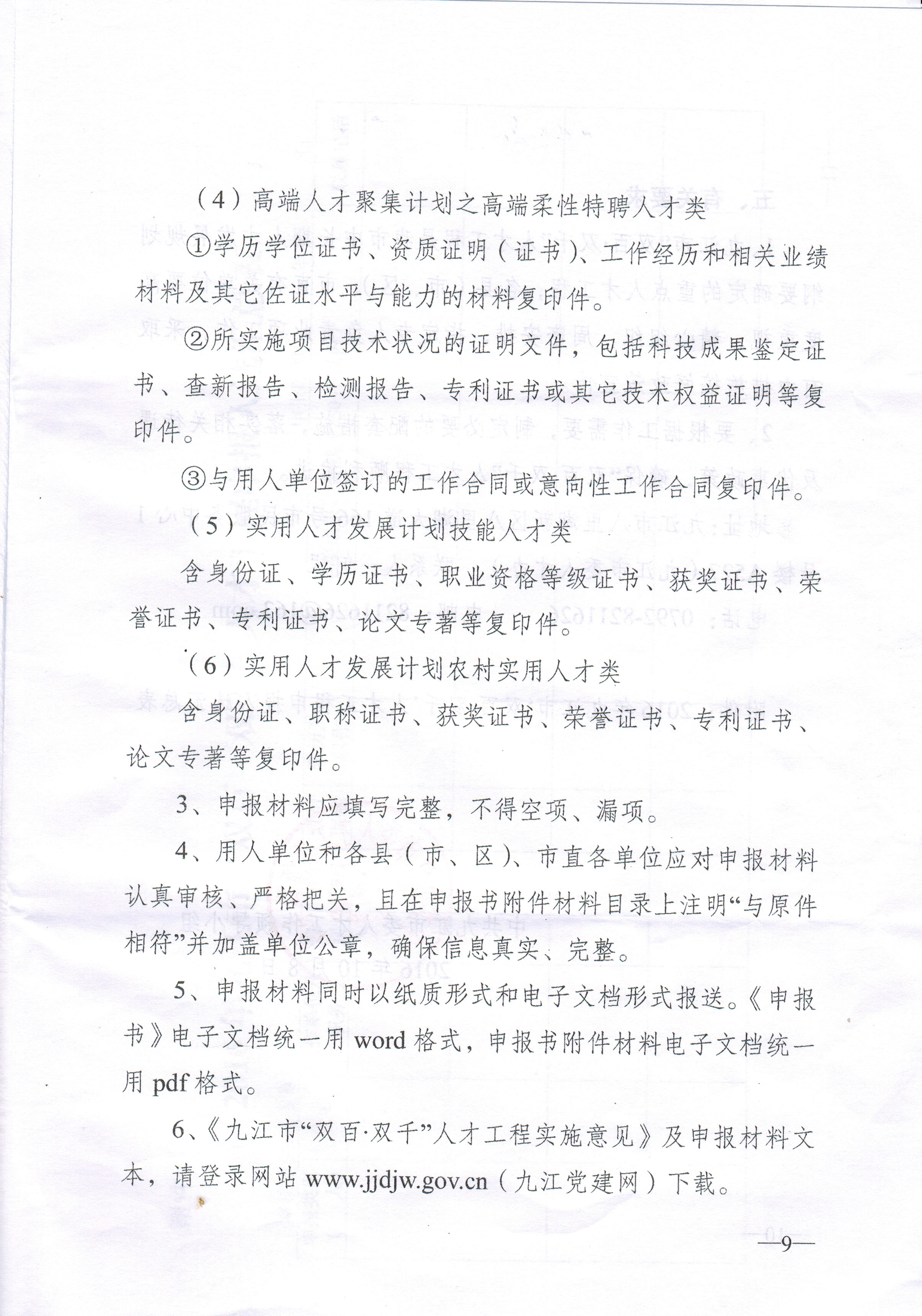 (说明:上述六类人才申报材料要求具体详见附件:中共九江市委人才工作领导小组《关于开展2016年九江市“双百•双千”人才工程申报推荐工作的通知》。)
