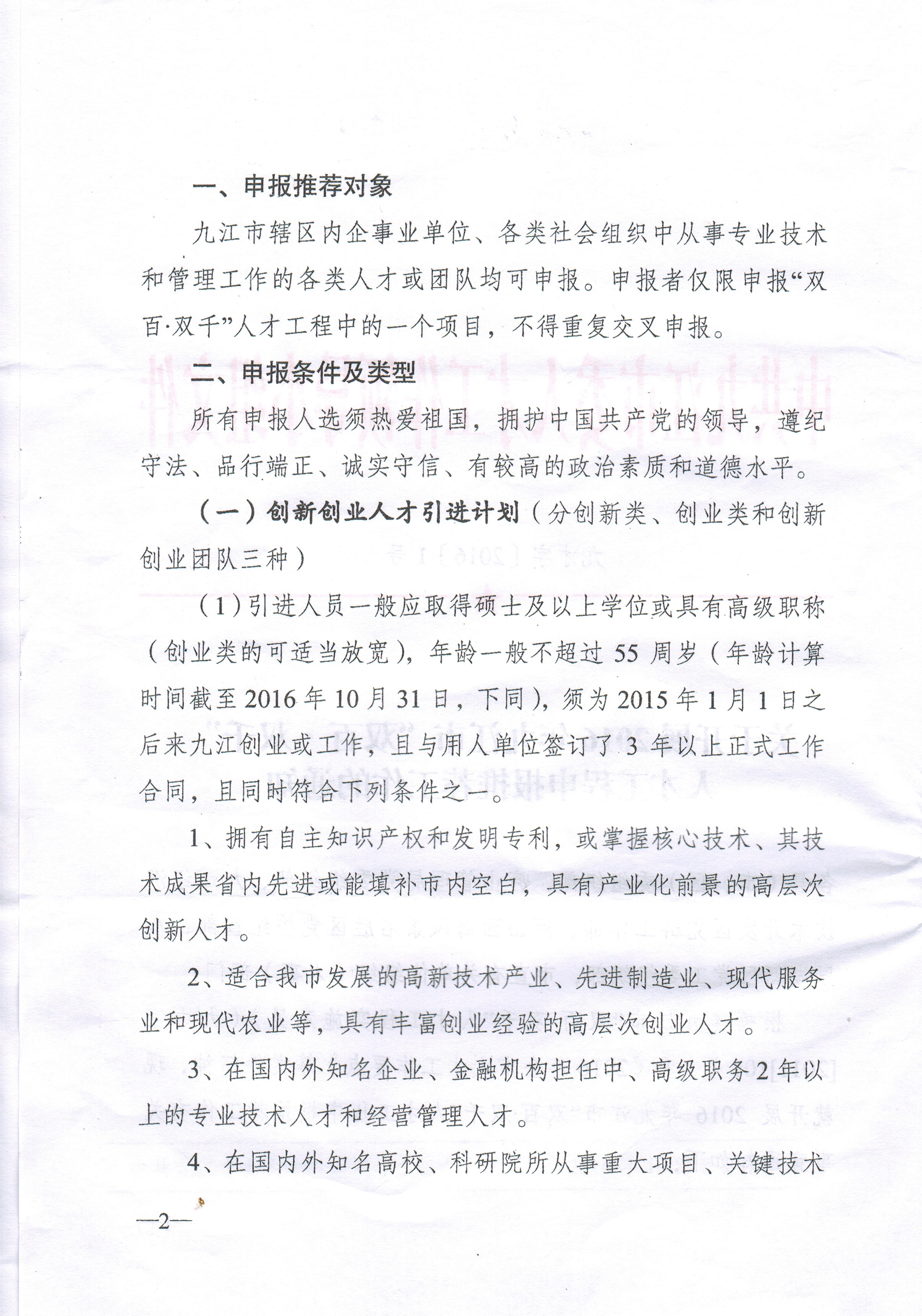 (说明:上述四大类人才申报条件具体详见附件:中共九江市委人才工作领导小组《关于开展2016年九江市“双百•双千”人才工程申报推荐工作的通知》。)