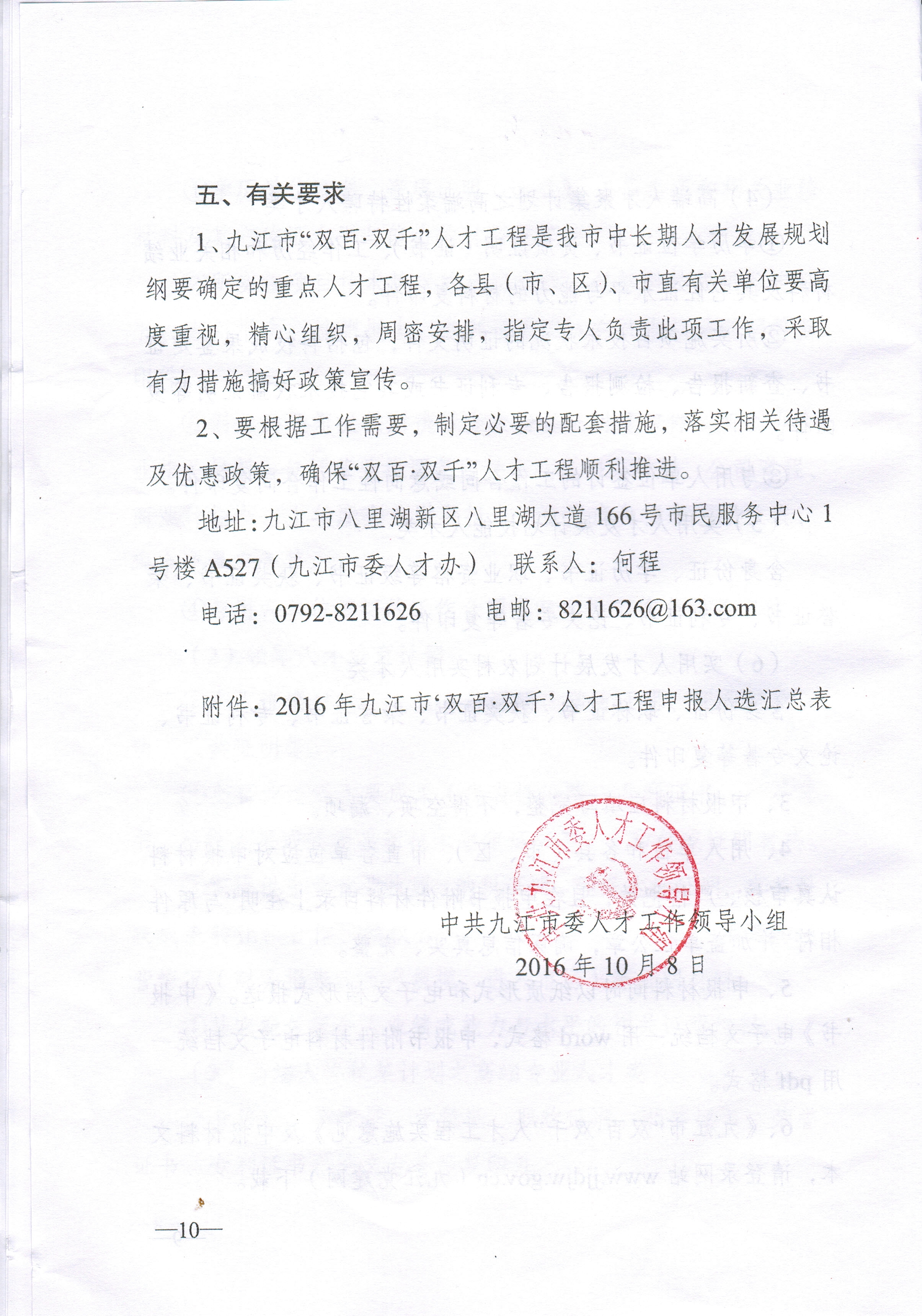 附件:九江市“双百双千”人才工程通知文件扫描件01.jpg九江市“双百双千”人才工程通知文件扫描件02.jpg九江市“双百双千”人才工程通知文件扫描件03.jpg九江市“双百双千”人才工程通知文件扫描件04.jpg九江市“双百双千”人才工程通知文件扫描件05.jpg九江市“双百双千”人才工程通知文件扫描件06.jpg九江市“双百双千”人才工程通知文件扫描件07.jpg九江市“双百双千”人才工程通知文件扫描件08.jpg九江市“双百双千”人才工程通知文件扫描件09.jpg九江市“双百双千”人才工程通知文件扫描件10.jpg中共九江市委人才工作领导小组《关于开展2016年九江市“双百•双千”人才工程申报推荐工作的通知》