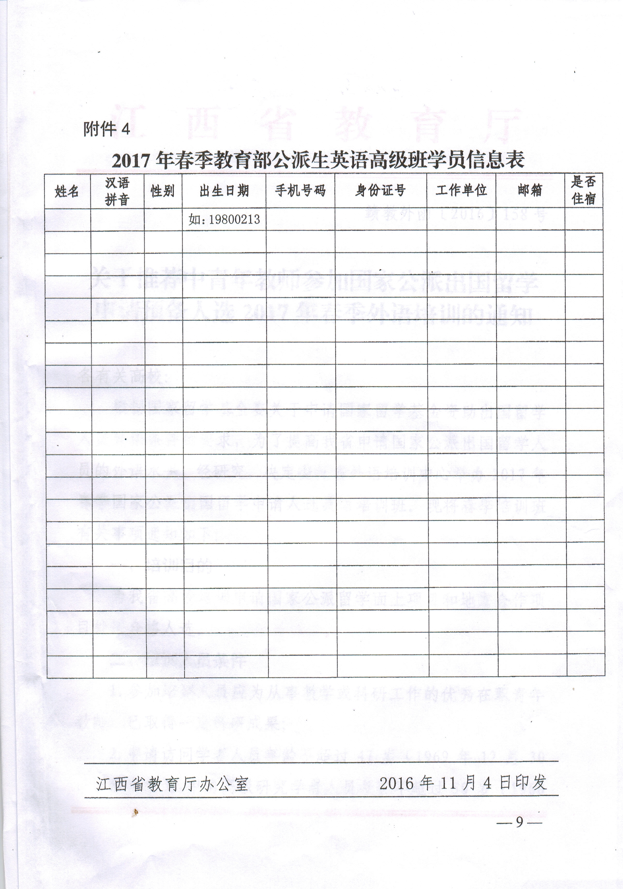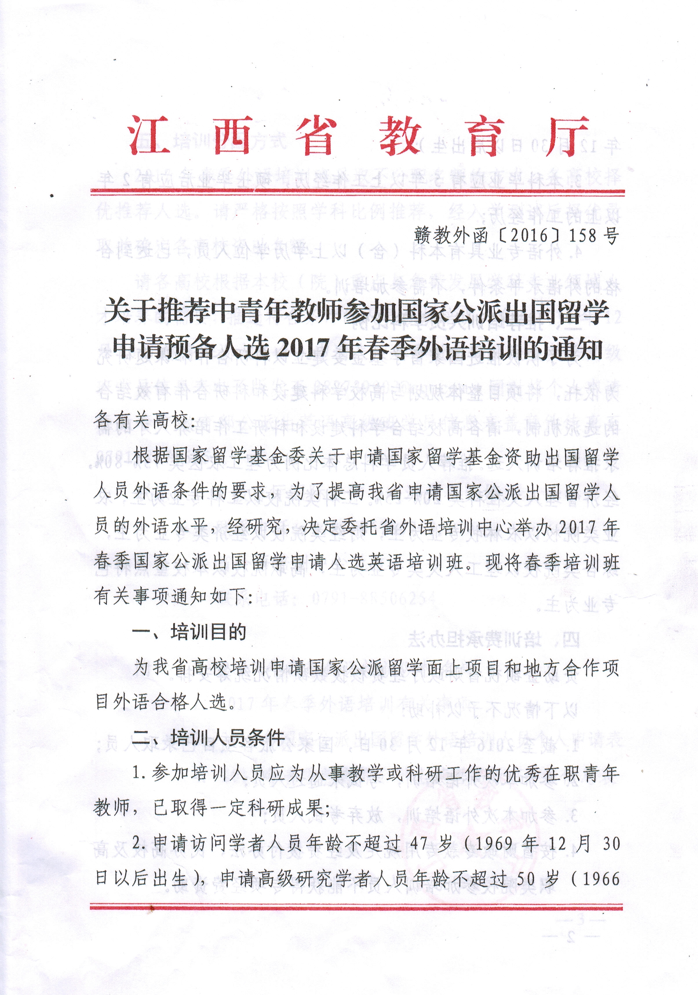 根据江西省教育厅《关于推荐中青年教师参加国家公派出国留学申请预备人选2017年春季外语培训的通知》(赣教外函﹝2016﹞158号)要求,现将有关事项通知如下: